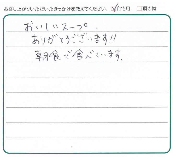 買い始めて3回目かしら。美味しいのでやめられません。味もいろいろあり、その日の気分で楽しんでいます。今後もずっと続くでしょう。日本一のスープ、体的にも変なまざりものなく、安心して頂けます。友人にも手土産にあげたり、皆さん、美味しいわね、と云ってます。(静岡県 U様 80代 女性)