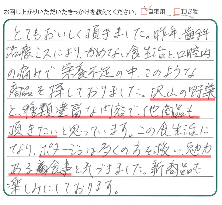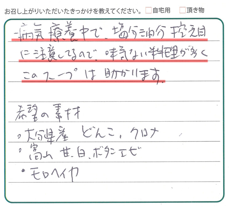 ⇒このたびは大切なお声をお寄せいただき、誠にありがとうございます。ご療養中でお食事に気を遣われる中、弊社のスープがお役に立てているとのこと、心より嬉しく思います。味付けに制限がある中でも「助かる」と感じていただけたことは、私たちにとって何よりの励みです。また、具体的な素材のご希望までお聞かせくださり、ありがとうございます。今後の商品づくりの参考として、大切に受け止めさせていただきます。これからも体にやさしく、無理なく続けられる味をお届けできるよう努めてまいります。どうぞご自愛ください。 -