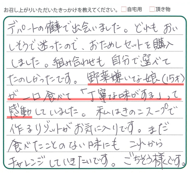 ⇒このたびは催事で弊社のスープに出会ってくださり、ありがとうございます。おためしセットを選ぶ時間も楽しんでいただけたとのこと、とても嬉しく拝見しました。野菜が苦手なお嬢さまが「丁寧な味がする」と言ってくださったことも、私たちにとって大きな励みです。きのこスープのリゾットも本当にお勧めです!これからも新しい味との出会いをお楽しみいただけるよう、心を込めてお届けいたします。 -