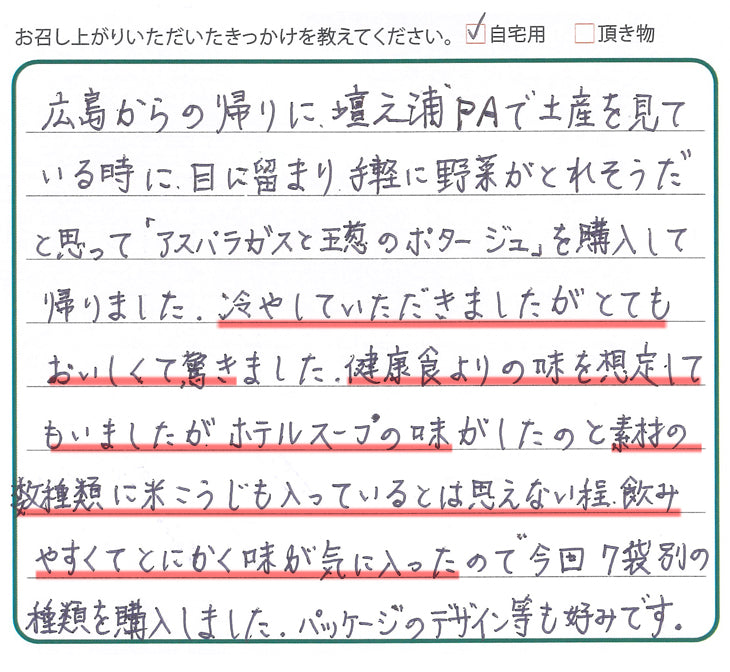 広島からの帰りに、壇ノ浦PAで土産をみている時に目に留まり手軽に野菜がとれそうだと思って「アスパラガスと玉葱のポタージュ」を購入して帰りました。冷していただきましたがとてもおいしくて驚きました。健康食よりの味を想定してもいましたがホテルスープの味がしたのと素材の数種類に米こうじも入っているとは思えない程飲みやすくてとにかく味が気に入ったので今回7袋別の種類を購入しました。パッケージのデザイン等も好みです。 (福岡県 M様 50代 女性)