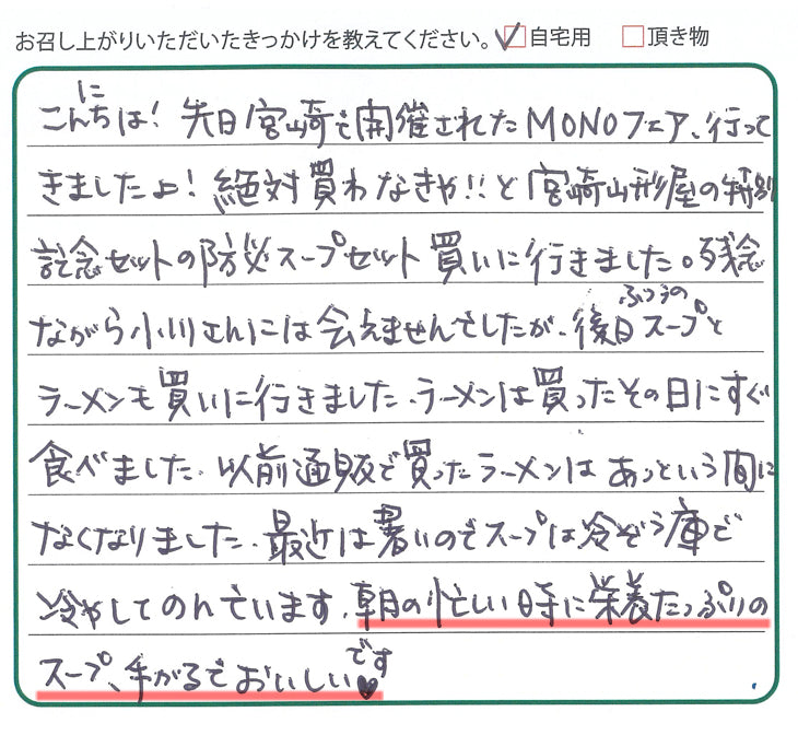 こんにちは!先日宮崎で開催されたMONOフェア、行ってきましたよ!絶対買わなきゃ!!と宮崎山形屋の特別記念セットの防災スープセットを買いに行きました。残念ながら小川さんには会えませんでしたが、後日ふつうのスープとラーメンも買いにいきまいした。ラーメンは買ったその日にすぐ食べました。以前通販で買ったラーメンはあっという間になくなりました。最近は暑いのでスープは冷ぞう庫で冷してのんでいます。朝の忙しい時に栄養たっぷりのスープ、手がるでおいしいです♡