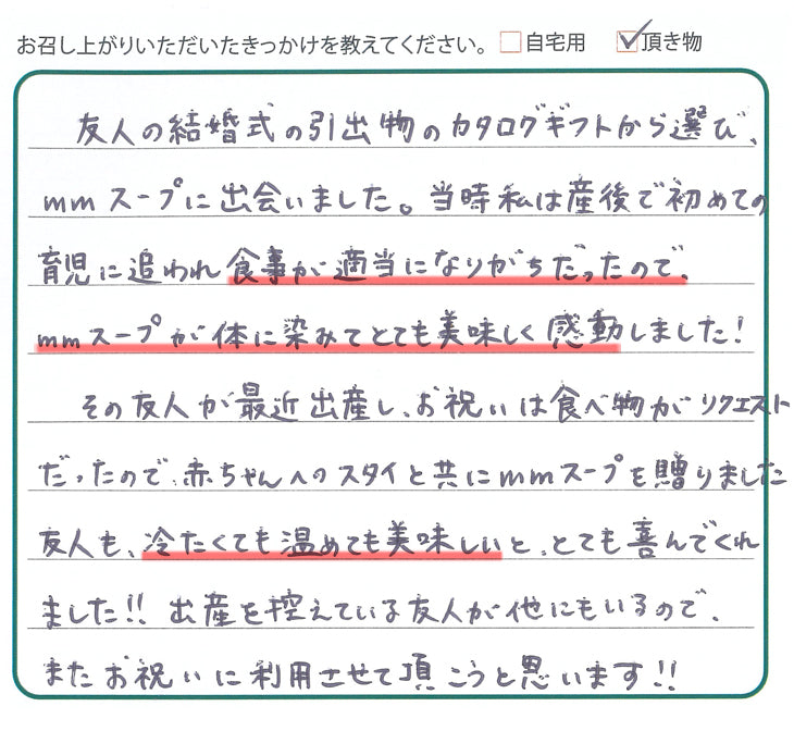 ⇒このたびは嬉しいお声をありがとうございます。ご自身のご出産後にmmスープを召し上がっていただき、「体に染みた」とのお言葉を頂戴し、大変嬉しく拝見しました。さらに大切なご友人へのお祝いとしてもお選びいただけたこと、スタッフ一同感謝の気持ちでいっぱいです。これからも“想いをつなぐスープ”として皆さまの心と体に寄り添えるよう、真心を込めてお届けしてまいります。