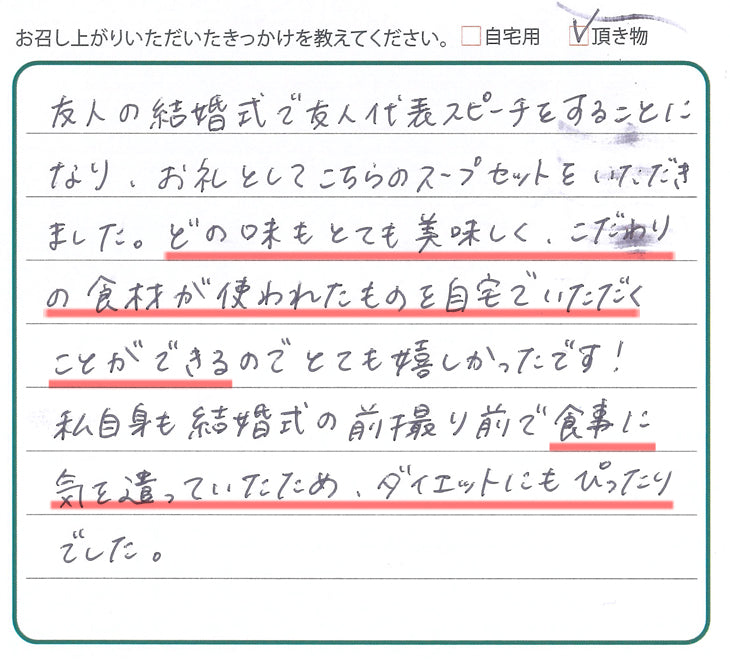 ⇒このたびは心温まるお便りをありがとうございます。ご友人の結婚式という特別な日に弊社のスープが贈り物として選ばれたこと、そしておいしく召し上がっていただけたことを大変嬉しく思います。こだわりの食材を使ったスープが、前撮り前の大切な時期の食事にもお役立ていただけたとのこと、光栄です。これからも体にやさしく、幸せな時間に寄り添えるスープをお届けしてまいります。 -