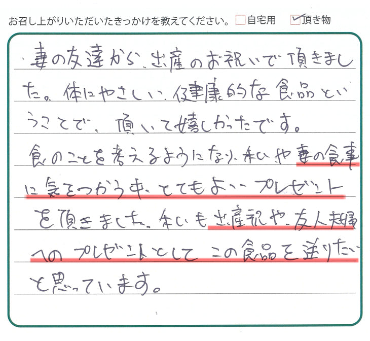 妻の友達から出産のお祝いで頂きました。体にやさしい健康的な食品ということで頂いて嬉しかったです。食のことを考えるようになり、私や妻の食事にきをつかう中とてもよいプレゼントを頂きました。私も出産祝や友人夫婦へのプレゼントとしてこの食品を送りたいと思っています。