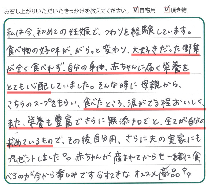 ⇒このたびは心のこもったお便りをいただき、誠にありがとうございます。つわりでお辛い中、弊社のスープを召し上がって「涙が出るほどおいしかった」と感じていただけたこと、胸が熱くなる思いです。ご自身の栄養はもちろん、ご家族への贈り物にも選んでくださり、心より感謝申し上げます。また弊社のスープは離乳食としても召し上がっていただく方も多いようです。ぜひお子様と一緒に食べていただき、野菜が大好きなお仲間が増えることを願っています♪これからも体と心にやさしく寄り添えるスープをお届けできるよう、真心を込めて努めてまいります。 -