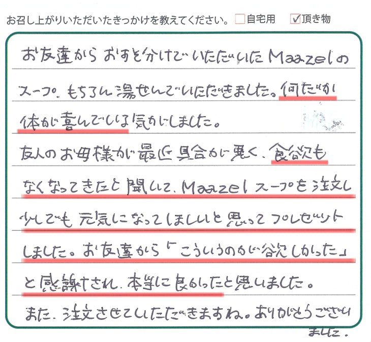 お友達から おすそ分けでいただいたMaazelのスープ、もちろん湯せんでいただきました。何だか体が喜んでいる気がしました。友人のお母様が最近具合が悪く、食欲もなくなってきたと聞いて、Maazelスープを注文し少しでも元気になってほしいと思ってプレゼントしました。お友達から「こういうのが欲しかった」と感謝され、本当に良かったと思いました。また注文させていただきますね。ありがとうございました。