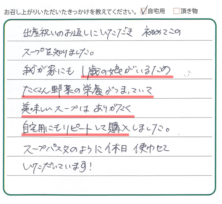 ⇒産後の大変な時に当店のスープがお役に立てたのですね !