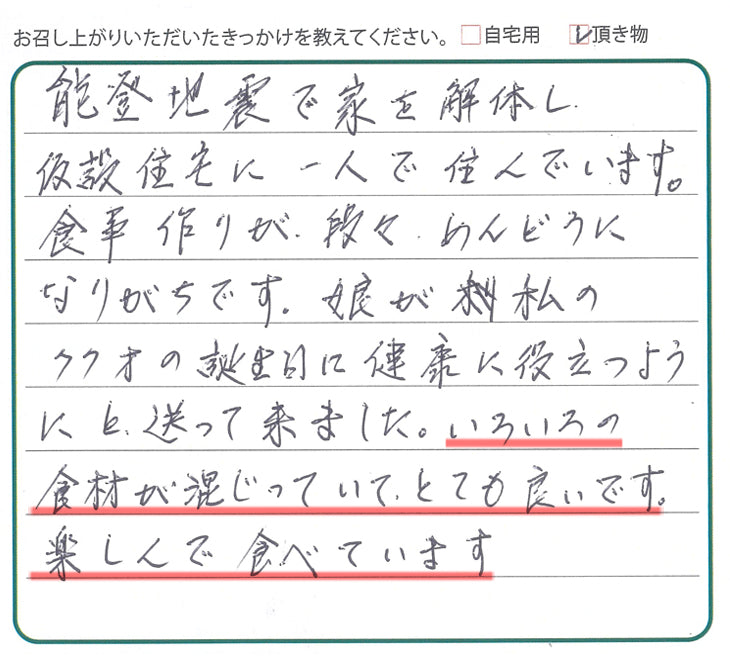 能登地震で家を解体し、仮設住宅に一人で住んでいます。食事作りが段々めんどうになりがちです。娘が私の77才の誕生日に健康に役立つようにと送って来ました。いろいろの食材が混じっていて、とても良いです。楽しんで食べています。