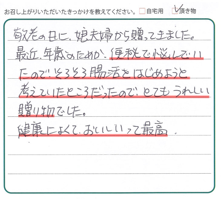 敬老の日に、娘夫婦から贈ってきました。最近、年歳のためか便秘で悩んでいたので、そろそろ腸活をはじめようと考えていたところだったので、とても嬉しい贈り物でした。健康によくて、おいしいって最高