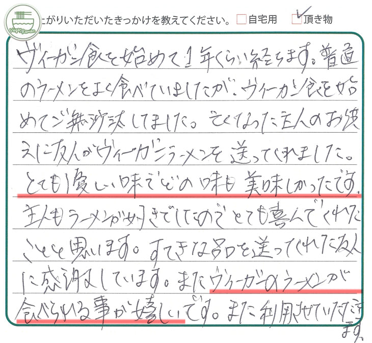 ⇒このたびは心のこもったお便りをお寄せいただき、誠にありがとうございます。ご主人を想う大切なお供えに、弊社のヴィーガンラーメンをお選びいただけたこと、胸がいっぱいになる思いで拝見しました。優しい味わいを気に入っていただき、ラーメンがお好きだったご主人にも喜んでいただけたのでは…と思うと、私たちにとっても忘れられないお言葉です。ヴィーガンでも「またラーメンを食べたい」と感じていただける一杯を、これからも心を込めてお届けしてまいります。 -