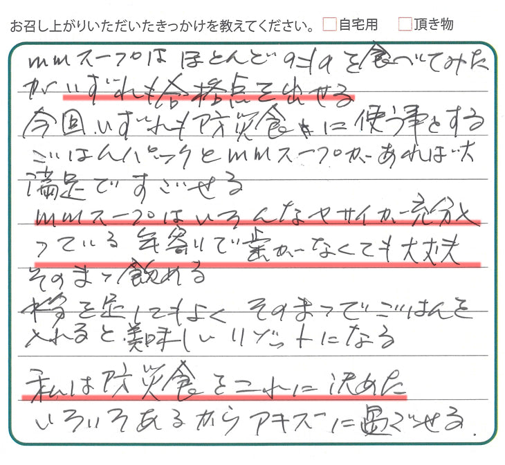 ⇒このたびは大変丁寧で力強いご感想をお寄せいただき、誠にありがとうございます。ほとんどの商品をお試しいただき、すべてに「合格点」を付けてくださったこと、心より光栄に存じます。防災食としてお選びいただき、ごはんと合わせたり、リゾットとして工夫して召し上がっていただいているご様子に、私たちも嬉しくなりました。歯や食事のご不安がある中でも安心して楽しめる点を評価いただけたことは、大きな励みです。これからも日常にも非常時にも頼っていただけるスープであり続けたいと思います。 -